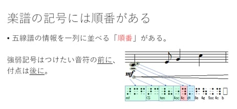 ビースコアによる点字楽譜の作り方 · 2022/06/27 点字楽譜の基本(その1) 前記号と後記号 点字楽譜は五線譜とほぼ同じ情報を表わすことができますが、書き方はまったく違います。 左から右へ楽譜が進んでいくのは一緒です。しかし、五線譜は上下に色々な情報を書けますが、点字楽譜では横一列に並べていきます。 したがって、1つの音符についての情報はその前後に並べる順序が決まっています。例えばメゾフォルテなどの強弱記号、テヌートなどの奏法記号は音符の前に、付点や指記号などは音符の後に書きます。ビースコアでは音符の前につける記号を前記号、後につける記号を後記号と呼んでいます。 tagPlaceholderカテゴリ: 点字読者, 点訳者 コメントをお書きください コメント: 0